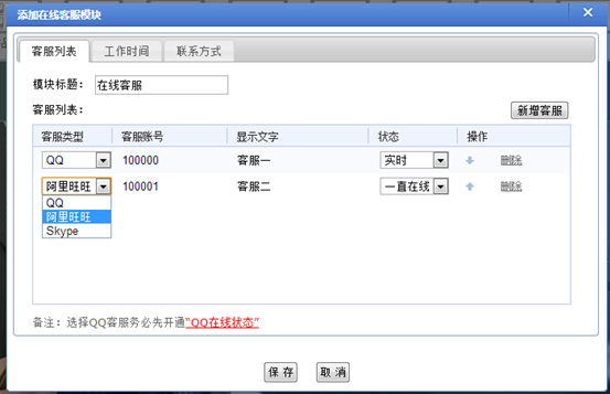 弹窗中,在线客服模块支持设置QQ、阿里旺旺和Skype等3种类型,还支持设置工作时间、联系方式